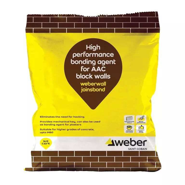 Weberwall Joinsbond is a single component bonding agent, which is specially designed for providing high bonding strength between difficult to bond building elements. This eliminates the need for hacking surfaces to achieve bonding. Use it for achieving a strong bond between AAC blocks and high-grade RCC, or between plaster and bare AAC block walls.