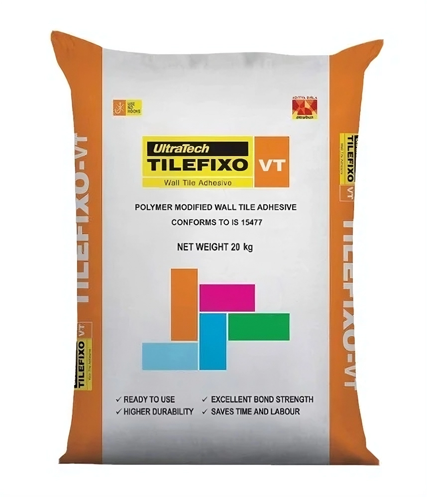 UltraTech TILEFIXO is a polymer modified cement-based high performance, high strength, high quality tile adhesive developed to fix tiles, Natural Stones over walls and floors. Suitable for both internal and external, thin bed applications. There are four variant of TILEFIXO for different application.VT-Premium Polymer modified Tile Adhesives for large format range of Vitrified and Porcelain Tiles for floor and wall application over concrete substrate and application for Tile on tile over substrate like Ceramic, Vitrified, Mosaic and Natural stone.