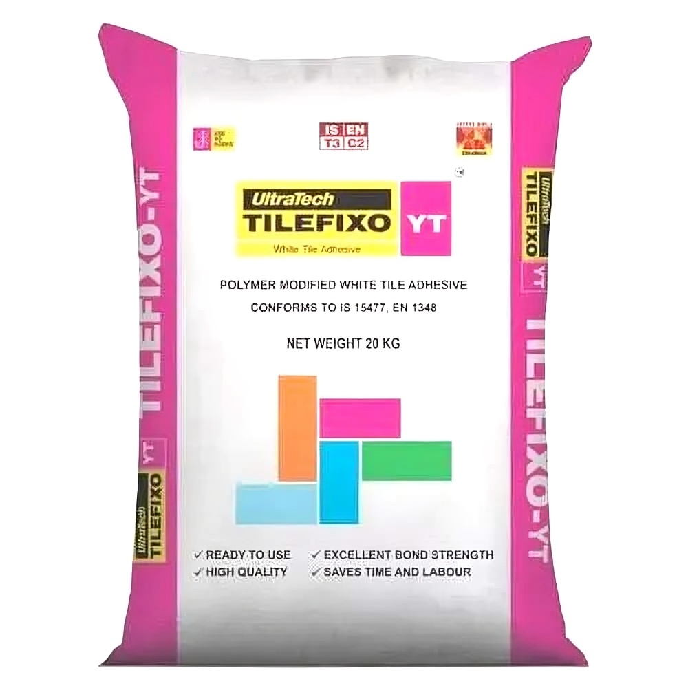 UltraTech Tilefixo-YT is a polymer modified, cement based high-performance, high-strength, and high-quality tile adhesive developed specifically for glass mosaic and marble tiles. It is suitable for both internal and external applications, as well as for tile-on-tile, tile-on-mosaic, and tile-on-cement floor applications. This adhesive is designed to provide excellent bonding strength and is self-curing, making it ideal for a wide range of decorative tiling projects.Premium White cement based Polymer modified Cementitious Tile Adhesives for Italian and Indian Marble stone for substrate on concrete and over stone flooring.