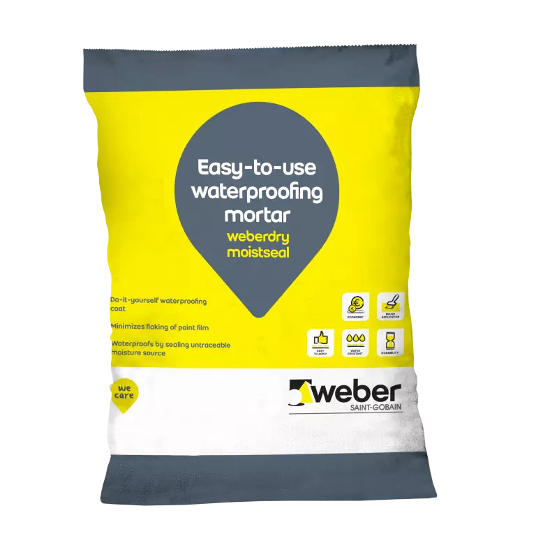 Weberdry moistseal is an easy to use, single-component waterproofing mortar for application of external walls of bathrooms and toilets and concrete walls. weberdry moistseal applied in 2 coats is a SMART active waterproofing barrier which seals the concrete pores and arrests the flow of water in either direction.
