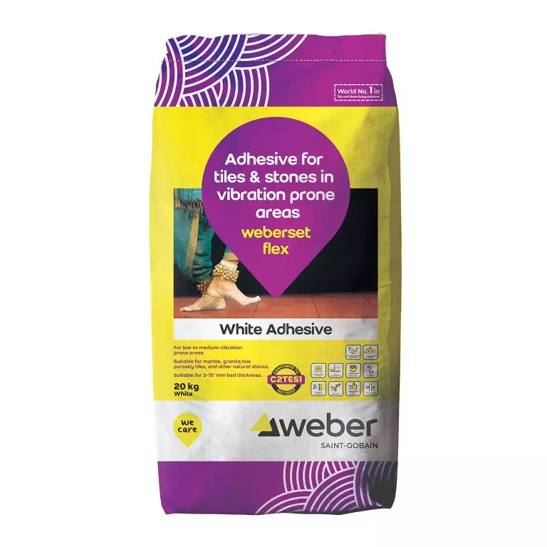 Weberset flex is a flexible, highly polymer-modified, high-performance, thin-set adhesive, for tiles, mosaics and stones, on a variety of substrates, which are prone to vibration. It is suitable for both vertical and horizontal application, in indoor as well as outdoor use. It is supplied as a dry mix mortar, to which water needs to be added before application.