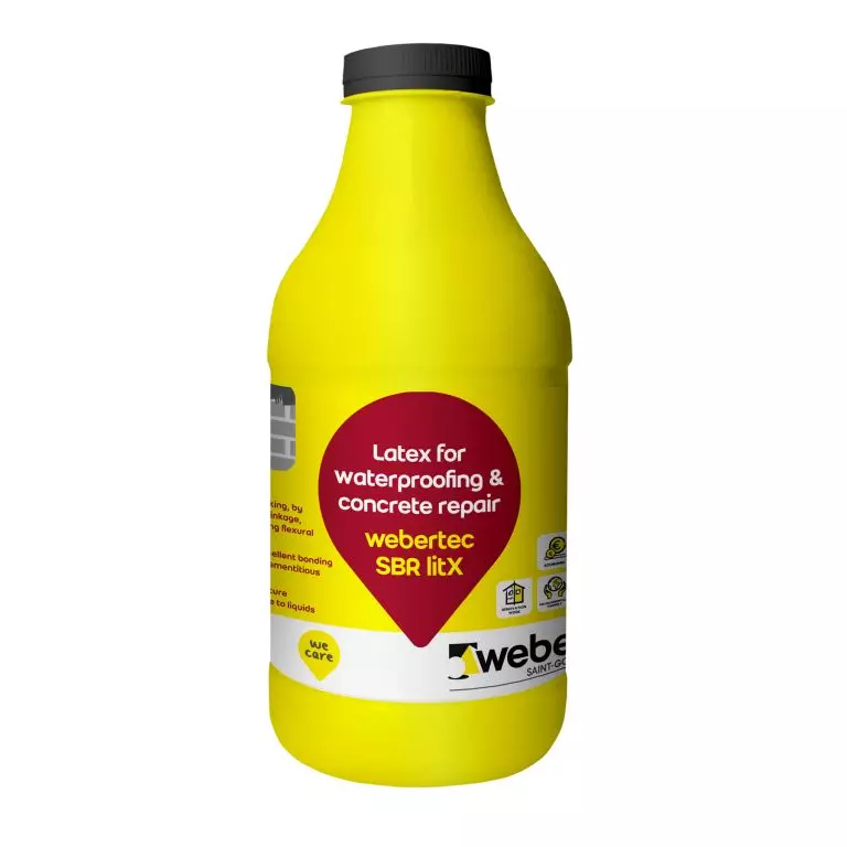 Webertec SBR litX is a styrene-butadiene copolymer latex liquid, with 37% solid content, which can be used as a modifier for concrete/cement mortar, providing them properties, so that they can be used for waterproofing, for repairs of spalled concrete and plaster, as a bonding agent and for high-performance plaster.